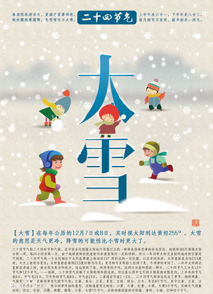 “大雪”是農(nóng)歷二十四節(jié)氣中的第21個(gè)節(jié)氣,更是冬季的第三個(gè)節(jié)氣,標(biāo)志著仲冬時(shí)節(jié)的正式開始;其時(shí)視太陽到達(dá)黃經(jīng)255度?!对铝钇呤蚣狻氛f:“大雪,十一月節(jié),至此而雪盛也。”大雪的意思是天氣更冷,降雪的可能性比小雪時(shí)更大了,并不指降雪量一定很大。